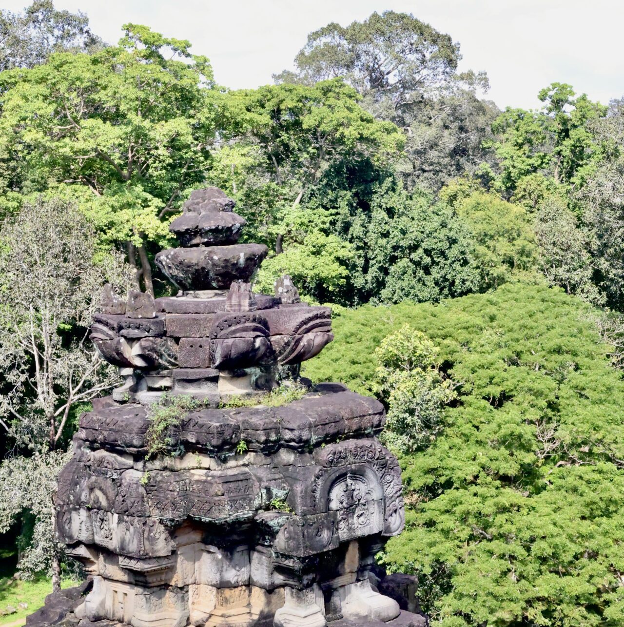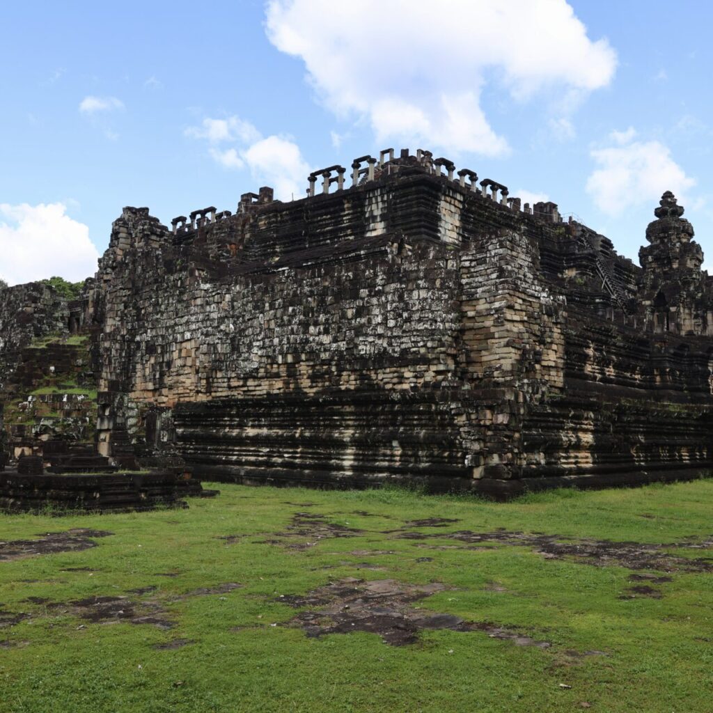 Baphuon quant à lui est beaucoup moins modeste. Avec ses 34 mètres de hauteur et son bouddha couché que l’on devine dans la pierre sur sa façade arrière, il fut avant la construction d’Angkor Wat le plus haut temple de la ville. Il est possible de grimper jusqu’à l’avant-dernier étage duquel l’on peut déjà admirer la grandeur du bâtiment et les cimes des arbres qui l’entourent.