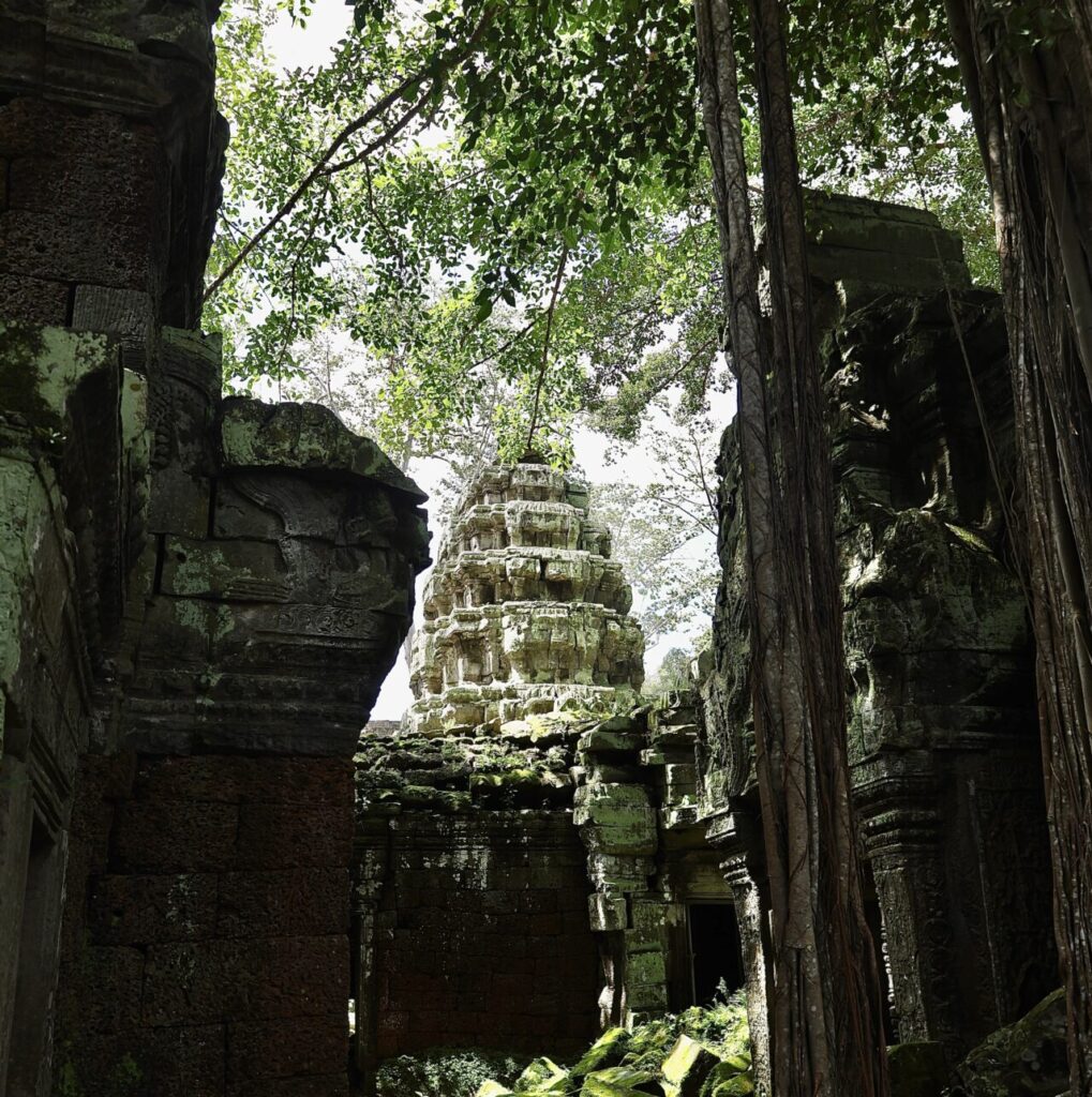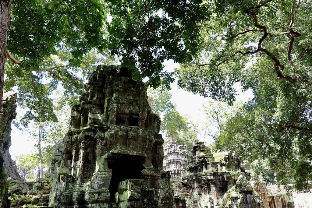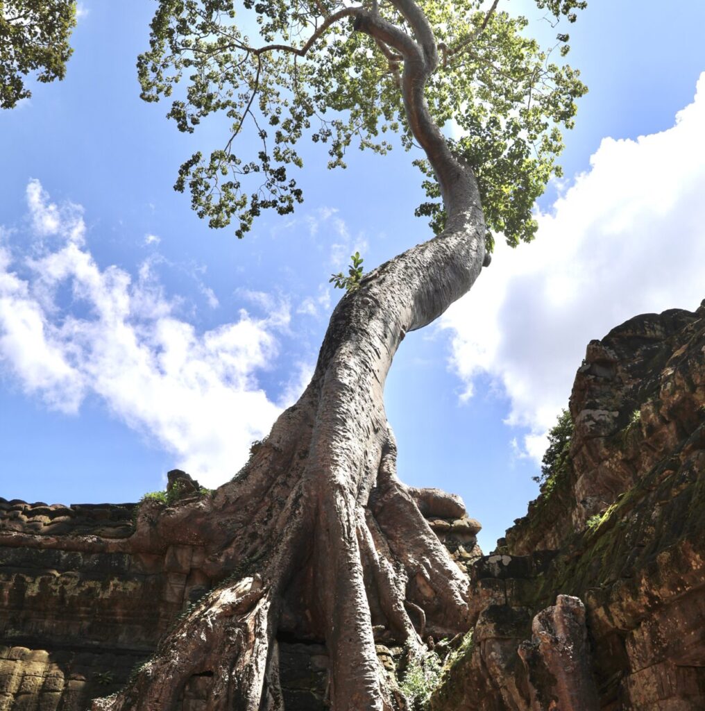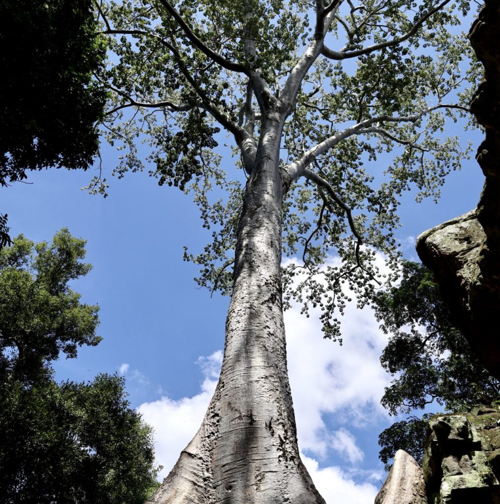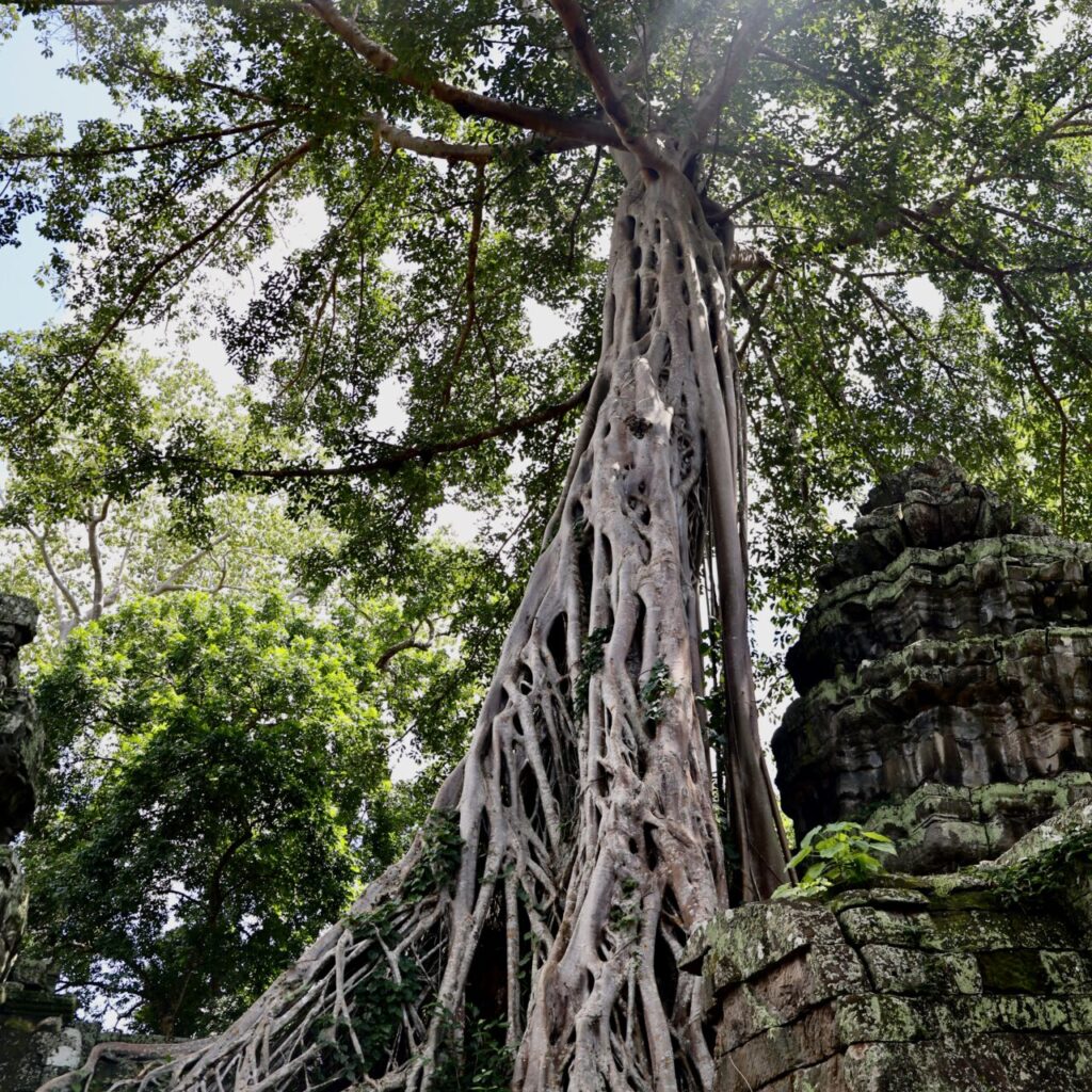 Parmi les arbres qui poussent autour du temple, les plus impressionnants sont les fromagers, ces colosses au tronc pâle et aux racines massives s’entortillant autour de la pierre. Leur nom a été donné par des explorateurs français qui trouvaient que leurs racines s’apparentaient à du camembert coulant sur les temples. L’un d’entre eux à Ta Prohm est envahi par un ficus étrangleur, donnant lieu à un magnifique et tragique spectacle puisque les ficus étrangleurs sont des parasites qui étouffent lentement leur hôte jusqu’à ce qu’il meurt.