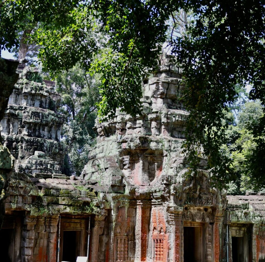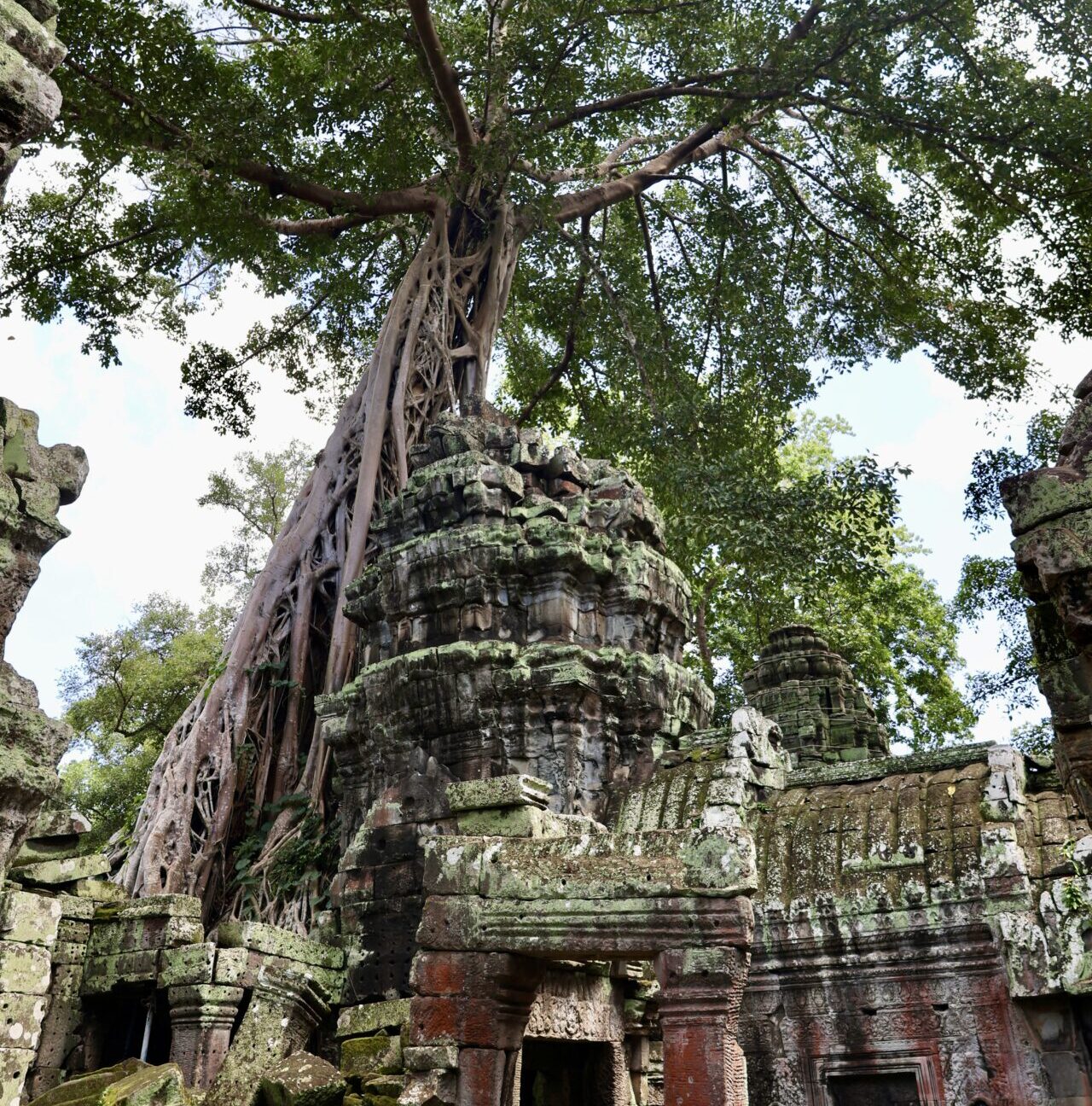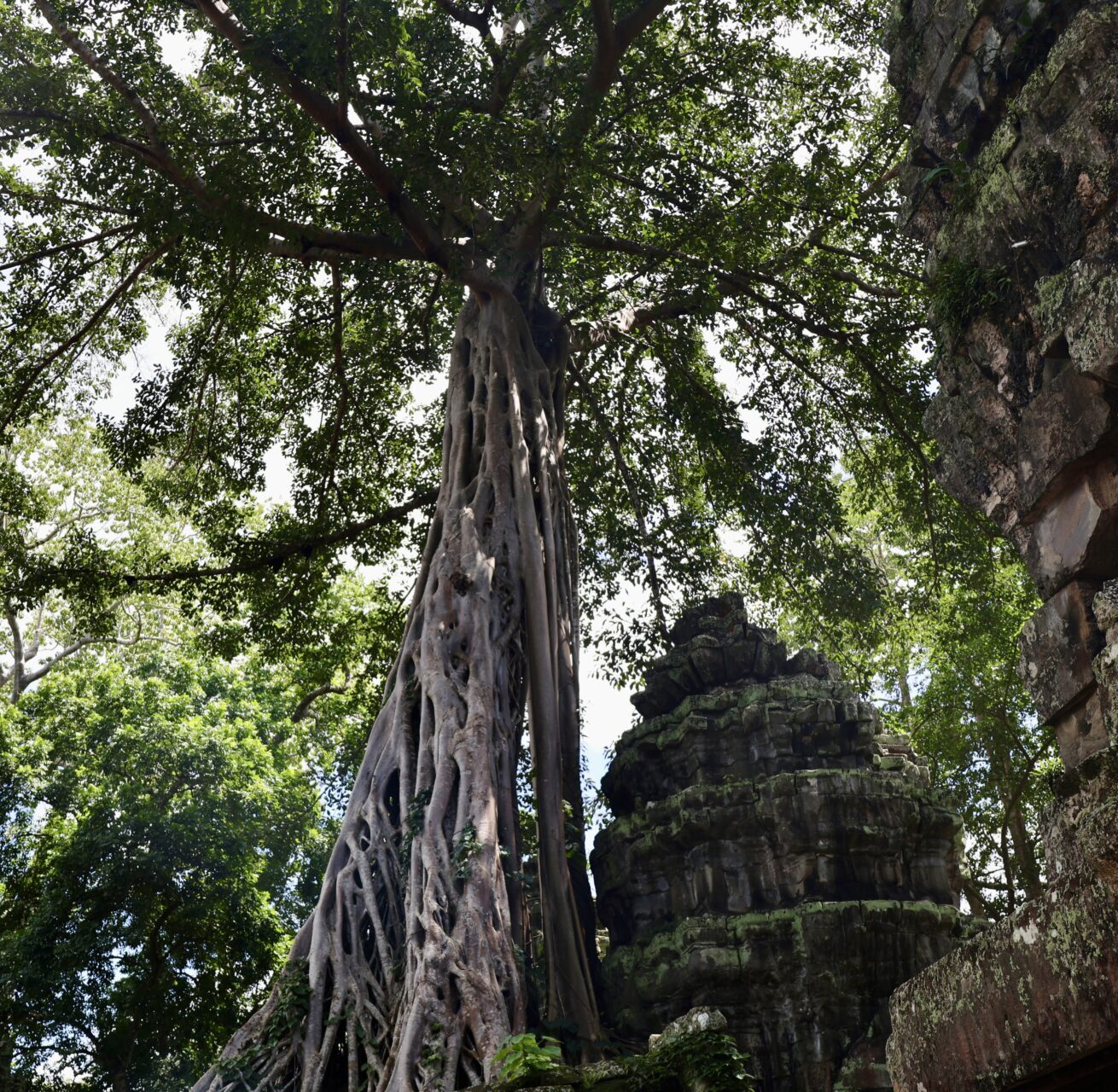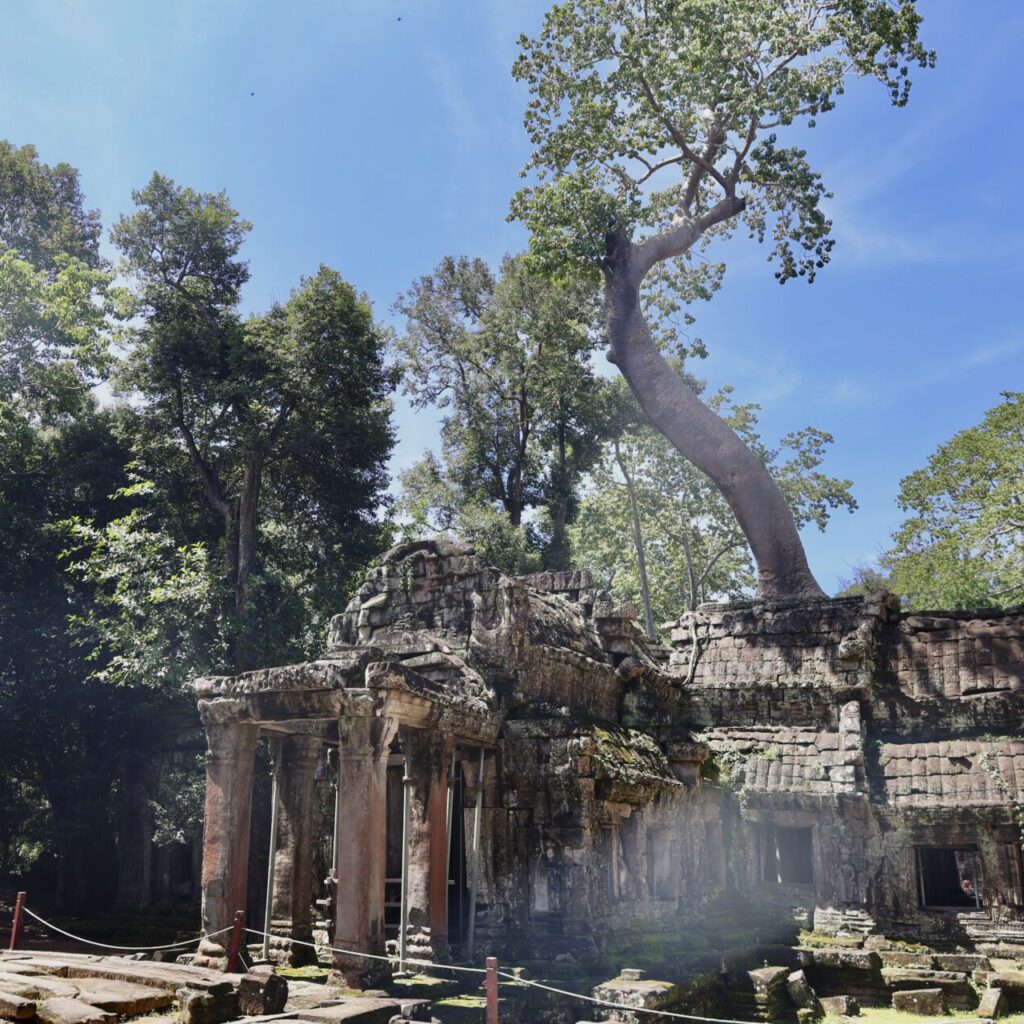 Parmi les arbres qui poussent autour du temple, les plus impressionnants sont les fromagers, ces colosses au tronc pâle et aux racines massives s’entortillant autour de la pierre. Leur nom a été donné par des explorateurs français qui trouvaient que leurs racines s’apparentaient à du camembert coulant sur les temples. L’un d’entre eux à Ta Prohm est envahi par un ficus étrangleur, donnant lieu à un magnifique et tragique spectacle puisque les ficus étrangleurs sont des parasites qui étouffent lentement leur hôte jusqu’à ce qu’il meurt.