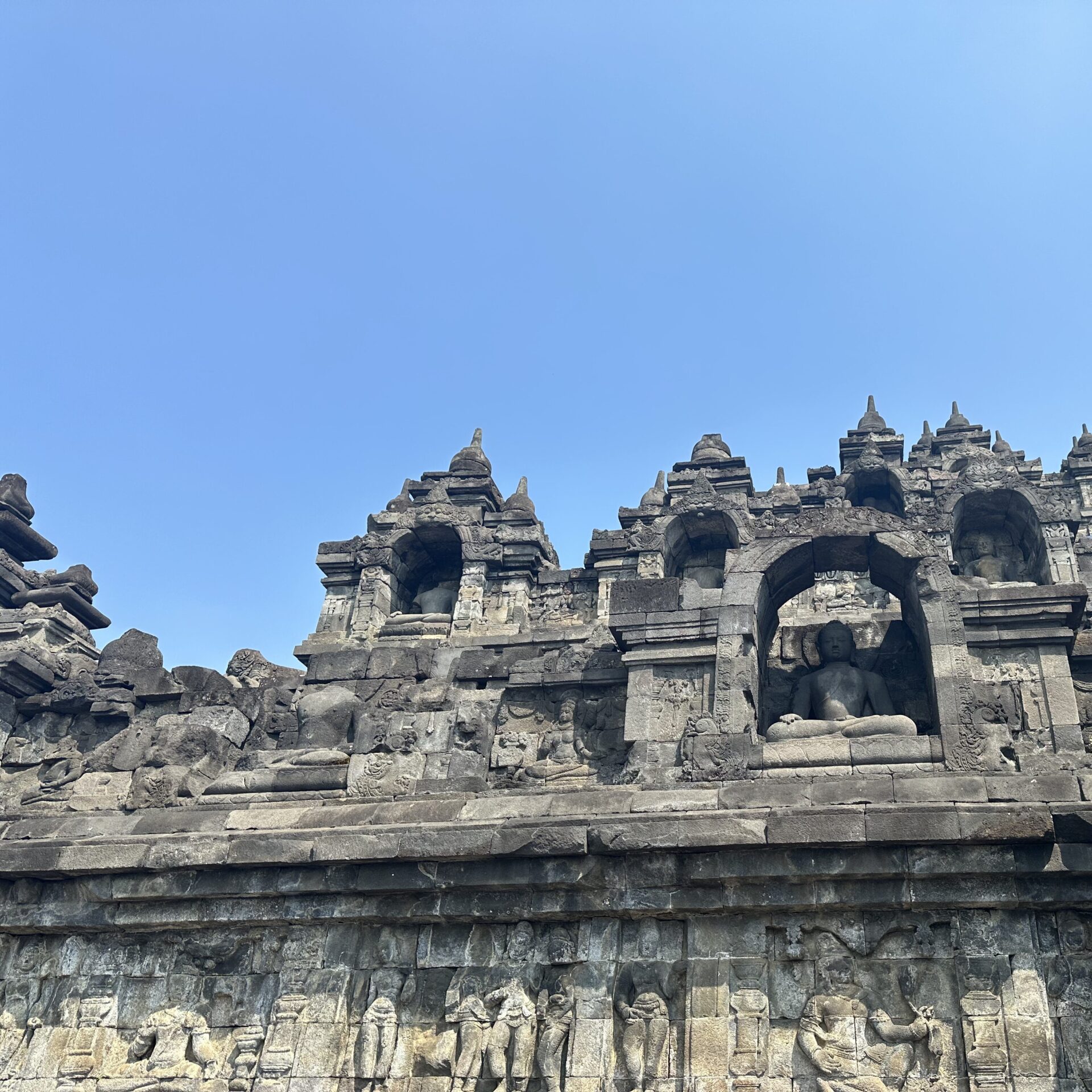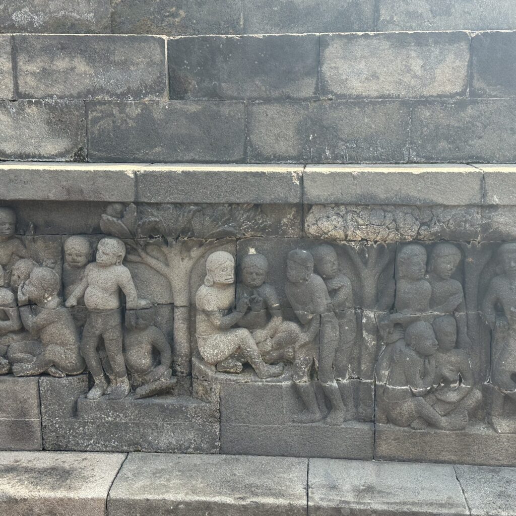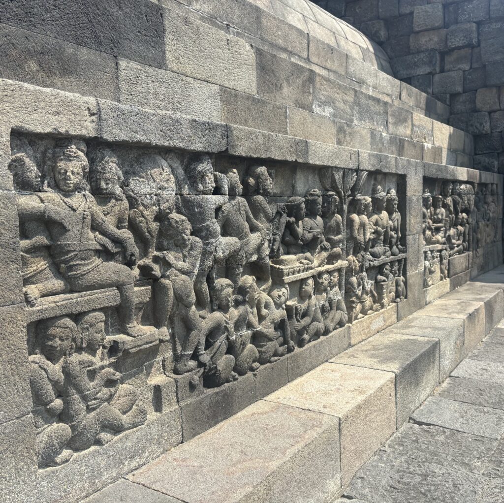 Sur les premiers niveaux, ce sont des dizaines de milliers de bas-reliefs qui son sculptés sur les parois et se lisent comme un livre à ciel ouvert, de la droite vers la gauche. Les détails et la précision des outils utilisés sont frappants. On y reconnaît des scènes de vie quotidienne des habitants de la région à l’époque, ainsi que des passages religieux, comme l’histoire du Bouddha. Au-dessus de ces gravures, des centaines de statues du personnage iconique se succèdent, dont la majorité ne sont pas entières : sur certaines il manque un bras, une jambe, voire même la tête, conséquences de la morsure du temps et de nombreux pillages.