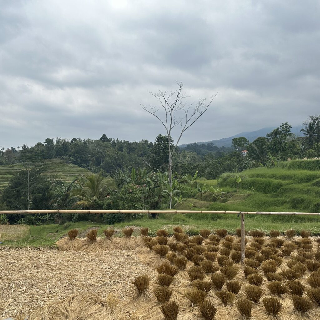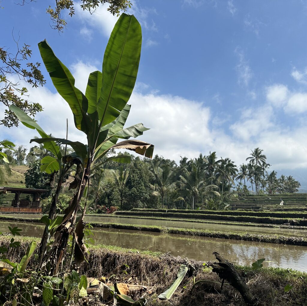 Enfin, les rizières de Jatiluwih sont parsemées de petits détails qui sont pourtant essentiels au paysage. D’immenses cocotiers encadrent les sentiers (attention aux chutes de fruit qui peuvent faire très, très mal !) et rafraîchissent les visiteurs avec un bon lait de coco proposé à tous les stands éparpillés au milieu des rizières. A leur pied, des plantes ornementales sacrées aux feuilles virant entre le rouge, le rose et le pourpre apportent leur lot de couleurs à un paysage déjà resplendissant (pour ta culture, leur nom est Cordyline Fructicosa, ou Ti en balinais 😉). Au gré de ta promenade, tu peux aussi apercevoir des petits temples en pierre volcanique, appelés Pura Subak, qui symbolisent l’harmonie entre la culture et la nature. Par respect pour leur caractère sacré, évite de t’en approcher à moins d’un mètre. Et enfin, il ne faut pas oublier les travailleurs qui, le dos courbé et les jambes pataugeant dans la boue, entretiennent les rizières et y cultivent la céréale la plus consommée dans le monde : le riz.