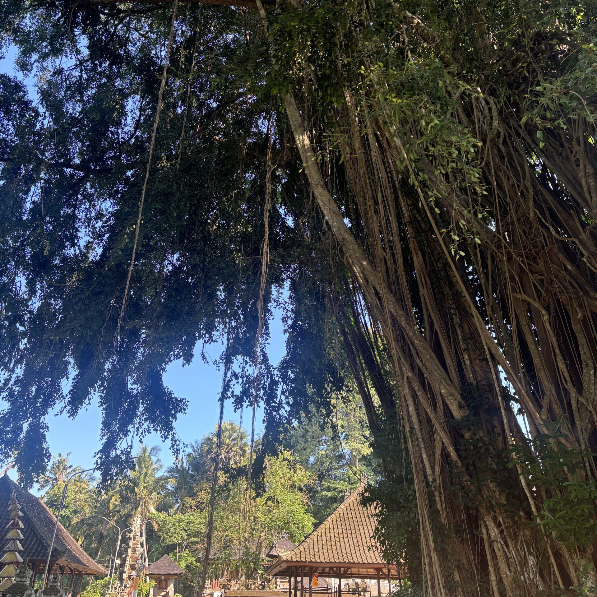 Situé dans le village de Bedulu, à moins de 20 minutes à pied de Goa Gajah, Pura Samuan Tiga est la définition même d’un temple hors des sentiers battus. Inconnu des circuits touristiques, il n’est recensé presque nulle part. On l’a d’ailleurs trouvé par pur hasard en cherchant des temples autour de Goa Gajah sur Google Maps ! Pourtant, c’est l’un des plus grands temples du coin, et il présente un nombre impressionnant de pagodes typiques de l’hindouisme balinais au toit en fibres de palmier noir, ainsi que de nombreux ornements sculptés comme des représentations du célèbre barong, facilement reconnaissable. Tu pourras aussi observer un gigantesque arbre aux lianes tombantes et aux racines imposantes, sûrement âgé d’un siècle ou deux.