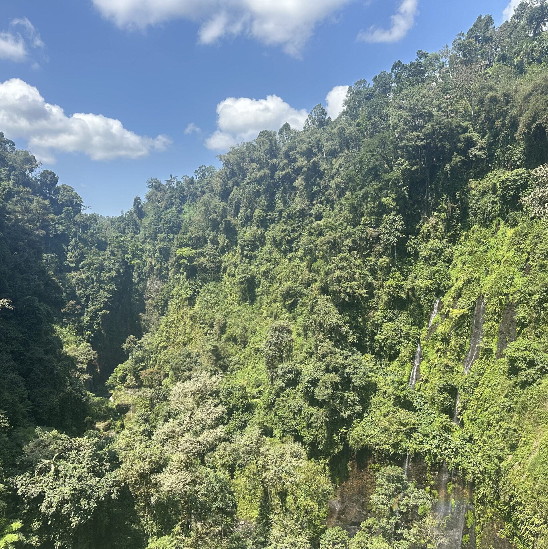 La deuxième, et c’est celle pour laquelle nous avons opté, c’est de descendre directement au pied de la cascade. L’entrée est plus chère (100,000 IDR), mais au moins ça rentabilise le trajet, et la visite vaut plus le coup. Si tu choisis cette option, n’oublie pas de prendre des chaussures d’eau car le sentier passe au milieu de rivières et de cascades ! Si tu n’en as pas, pas d’inquiétude, tu pourras en louer à l’entrée pour 20,000 IDR.