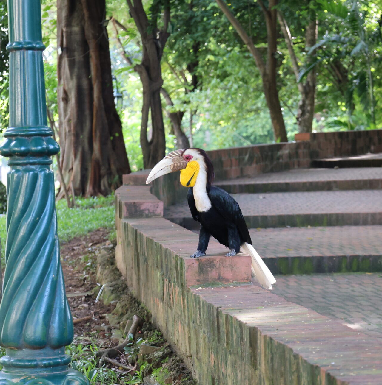 Un autel khmer où sont déposées des offrandes (à gauche), la montée principale de Wat Phnom (au centre), un calao curieux (à droite).