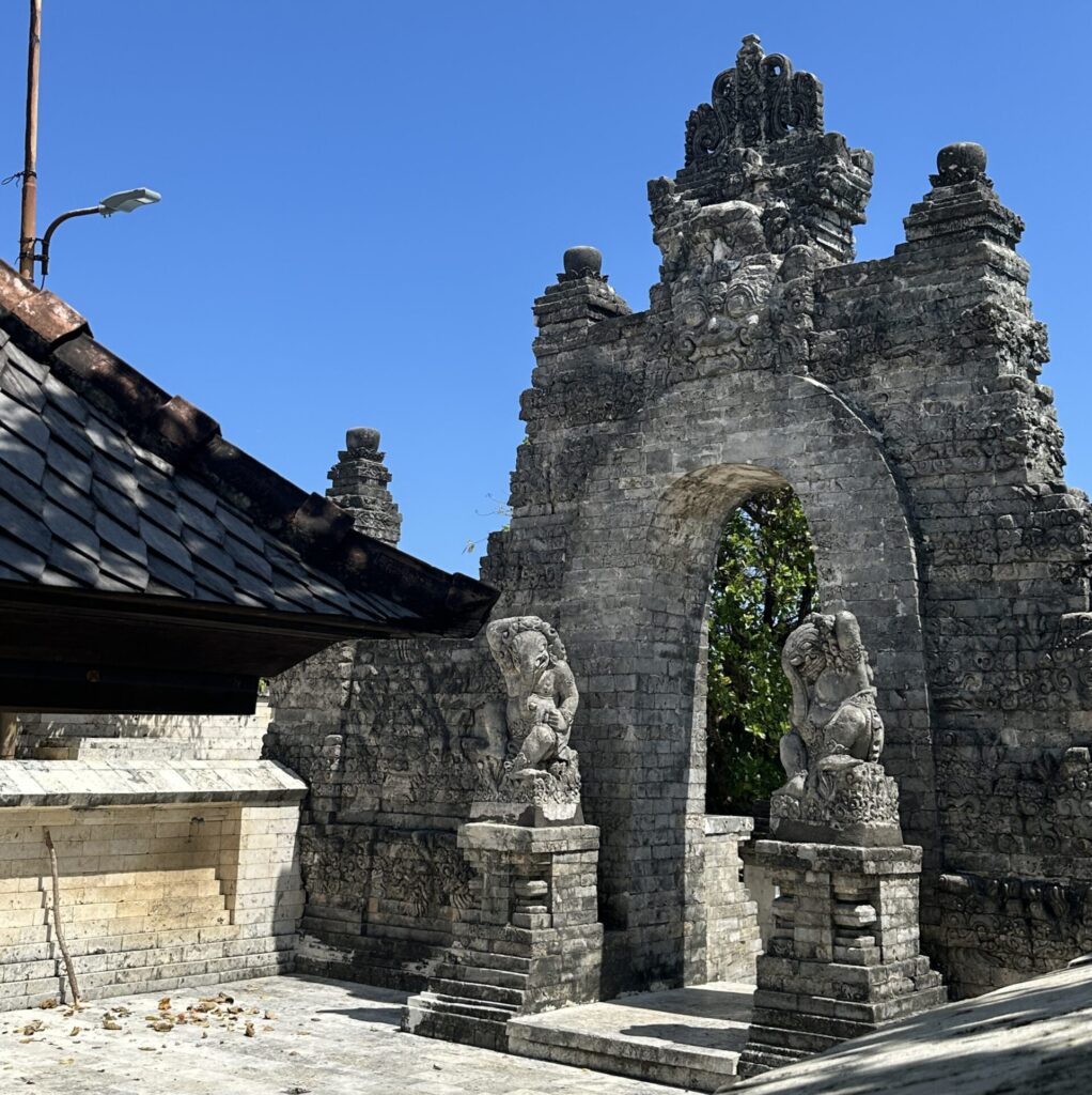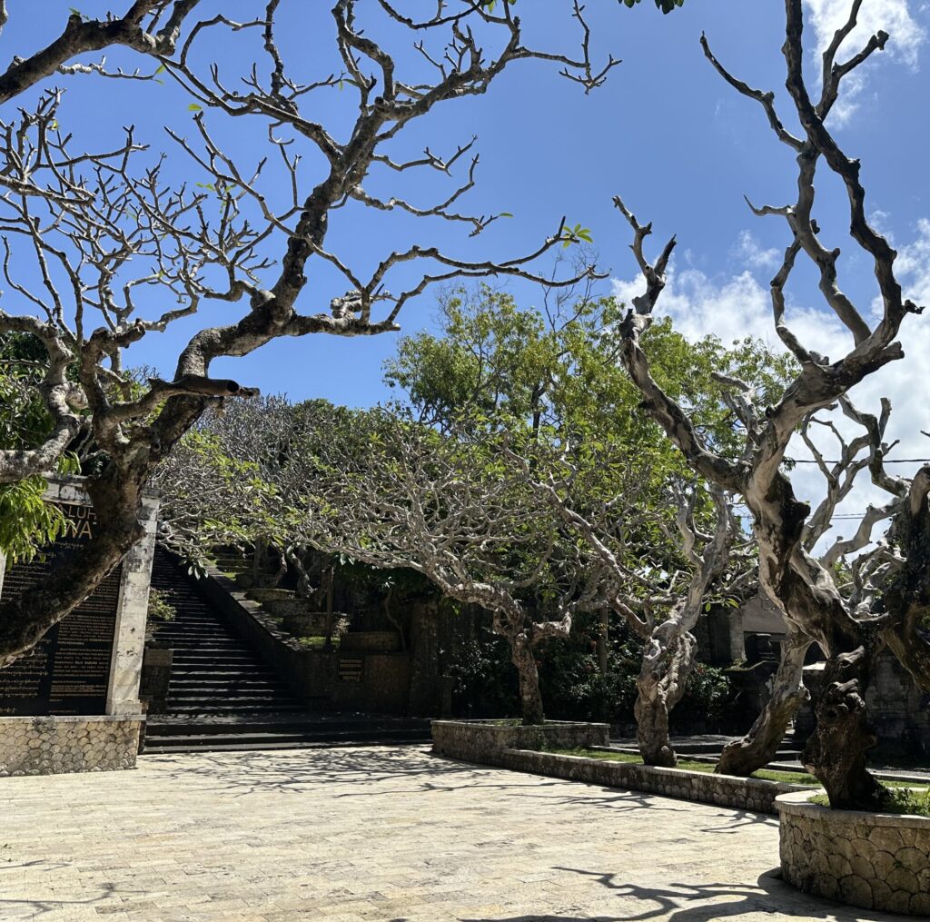 Eh oui, à la base, Pura Uluwatu c’est quand même un temple ! Perché sur sa falaise, le complexe n’est pas très grand et il y a souvent du monde, mais il est très joli ! En plus des nombreuses petites pagodes, tu peux admirer un escalier encadré d’arbres au tronc blanc et aux branches tortilleuses serpentant dans tous les sens, témoin des talents de paysagiste des bâtisseurs de cet édifice.
