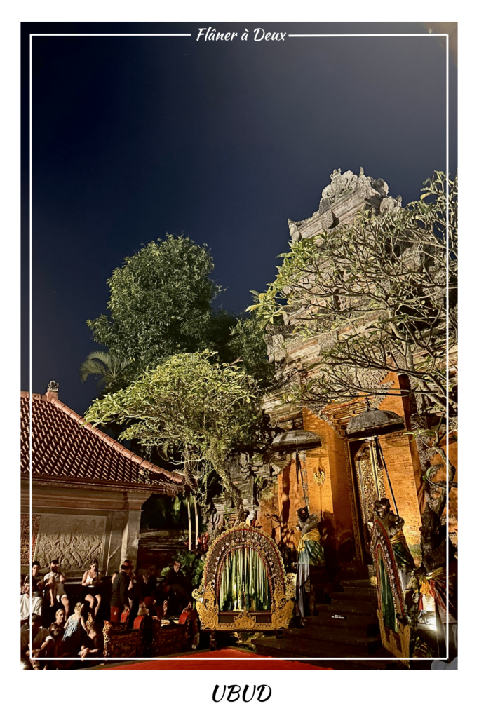 La danse Kecak, autre danse traditionnelle de l’île, est aussi performée à Ubud. Mais pour y assister, on te conseille plutôt le temple d’Uluwatu, au sud de Denpasar, qui organise ses spectacles tous les jours au coucher de soleil. Pour plus d’infos, on t’invite à consulter l’article que l’on a écrit dessus 😉.
