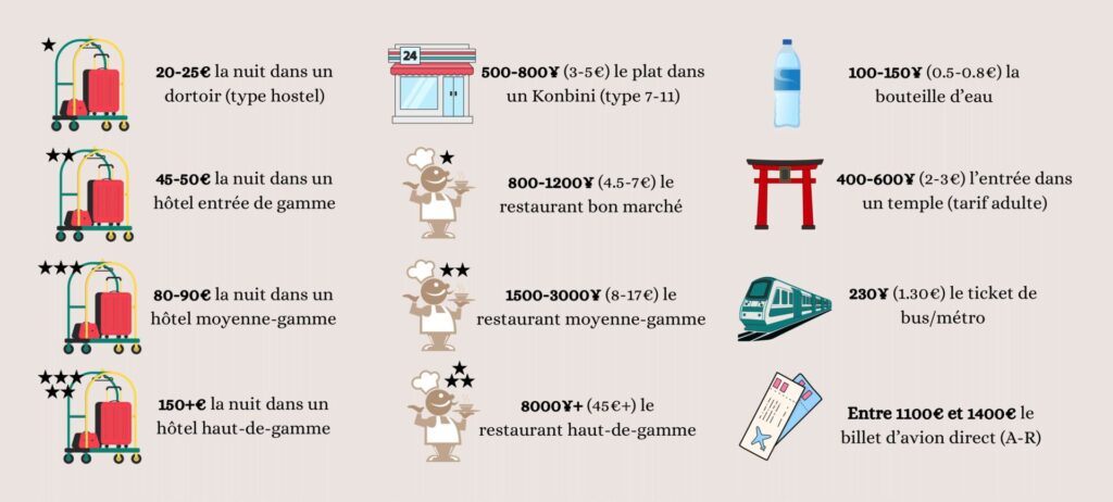 Le gros désavantage du Japon, c’est que c’est assez cher. Même si le coût de la vie y est environ 20% moins élevé qu’en France, dans les lieux touristiques et les grandes villes comme Osaka, Kyoto ou Tokyo (dont on te parle dans cet article), ça peut vite chiffrer. Le prix des hébergements peut notamment grimper, et s’apparente aux tarifs français. Côté nourriture, on s’en sort mieux, même si le prix du repas reste bien plus élevé que dans le reste de l’Asie. Le prix des activités est aussi raisonnable, mais encore une fois tout dépend de l’endroit où tu te trouves. Le budget que l’on te donne juste en-dessous se base donc sur une moyenne des villes de Tokyo, Kyoto et Osaka qui sont globalement les trois destinations principales d’un premier voyage au Japon, et celles que l’on te présente dans cet article.