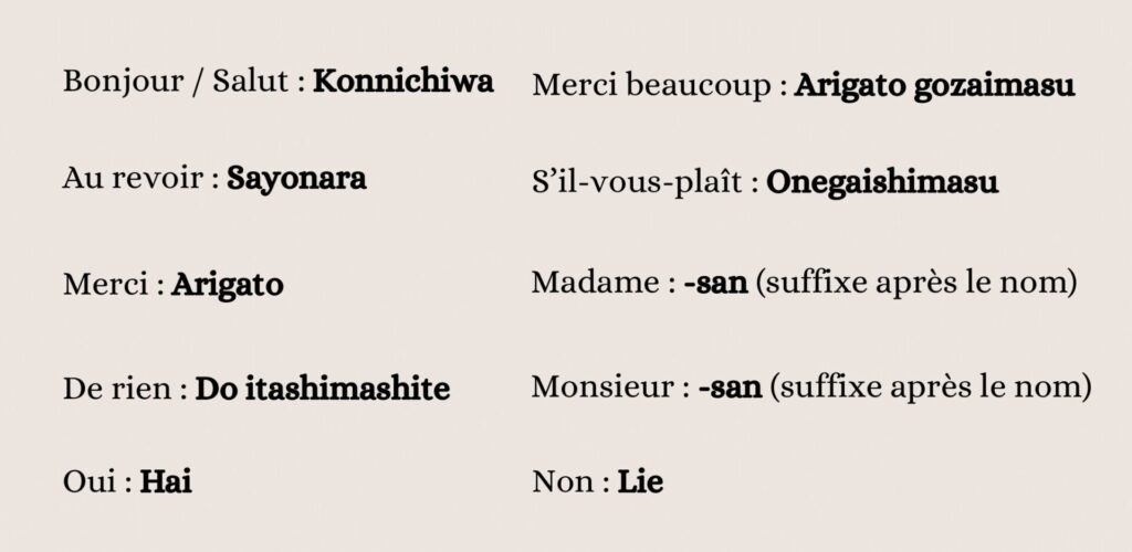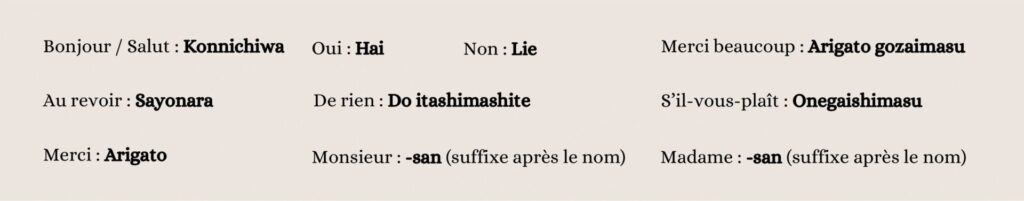 Avant de partir au Pays du Soleil Levant, voici quelques mots et expressions à connaître et à utiliser régulièrement durant ton voyage :