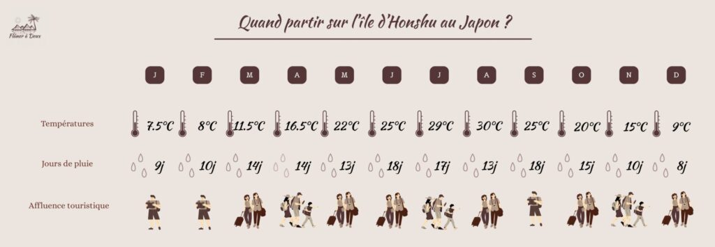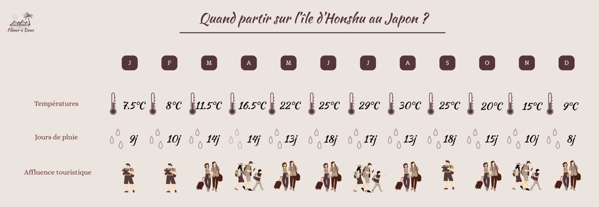 L’archipel japonais est très grand est comporte à la fois des îles paradisiaques et des steppes gelées. La période idéale pour t’y rendre dépend donc énormément de la région que tu veux explorer. Alors que l’île d’Hokkaido étincelle sous un épais manteau blanc en hiver, l’archipel d’Okinawa offre des températures agréables toute l’année, et l’île d’Honshu est extraordinaire au printemps et en automne. Comme nous n’avons pu explorer que cette dernière jusque là, on va se concentrer sur son climat que l’on connaît un peu mieux (nous y sommes allés à deux reprises, en été et en automne).